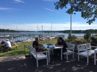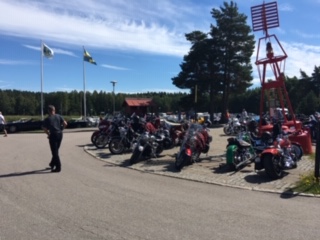 Joakim informerade om dagens tur som tog oss över vägar vi inte trodde existerade till Kållandsö och Läckö, mycket fina och härliga vägar. Första stoppet var vid Djurgårdsuddes café som drivs av Lidköpings Båtsällskap, där fick vi lite näring i oss i form av gott kaffe och fina mackor, väldigt fint ställe som varmt rekommenderas.