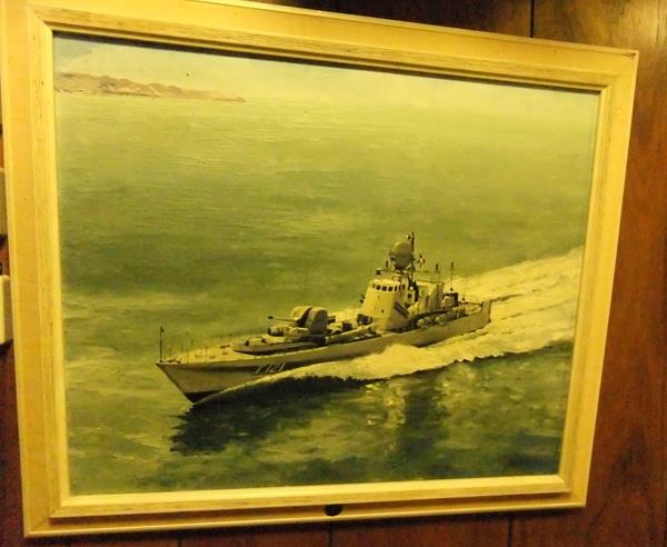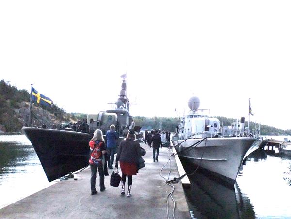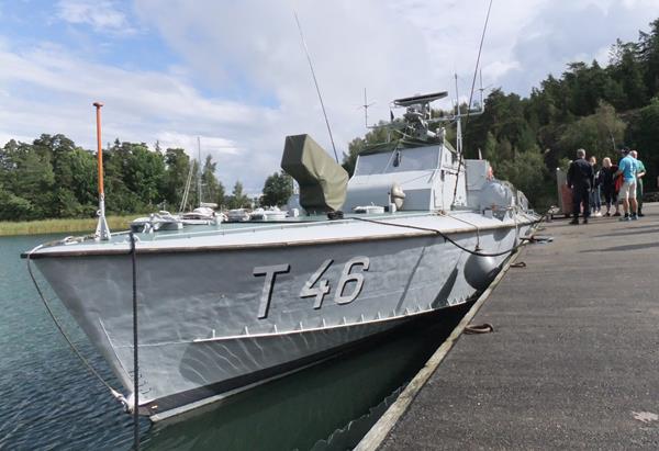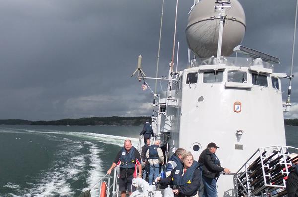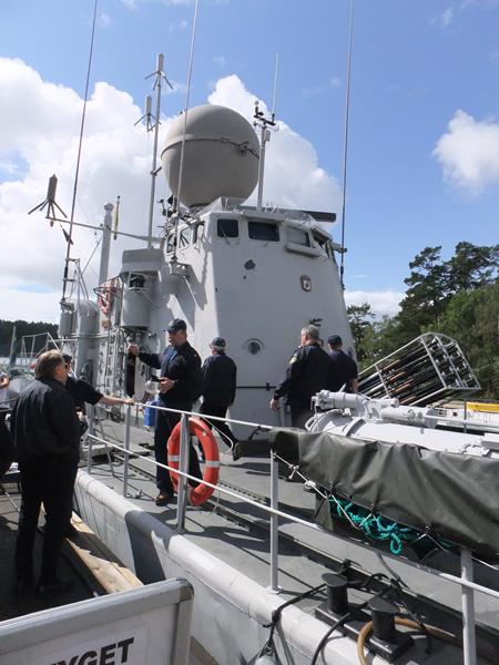 Så blev det dags för båtfärd efter bjudfika på kajen. Militärisk genomgång av säkerhetsbestämmelserna följde och vi drog på oss livvästarna medan gasturbinerna började så sakta rotera medan rök och eldsflammor slog ut från avgasrören i aktern. Vi gick ombord och solen började lysa på oss. Sakta backade torpedbåten ut från kaj, vände och satte kurs ut på Mysingen. Farten ökade till nästan 30 knop men då en av gasturbinerna var ur form nåddes förstås inte toppfarten på 40 knop. Efter några girar siktade vi flera ubåtar (svenska) under manöver. Tyvärr kom så regnet, vilket dock gjorde upplevelsen av att vara på sjön lite mera verklig. Åter tillbaka i hamn fick vi genomgång av båten med maskinrum, stridsledningscentral, kommandobrygga och kabyssen. Speciellt intressant var stridsledningscentralen under däck, varifrån båten navigerades i 40 knop mitt i natten. Prata om koncentrationsjobb.