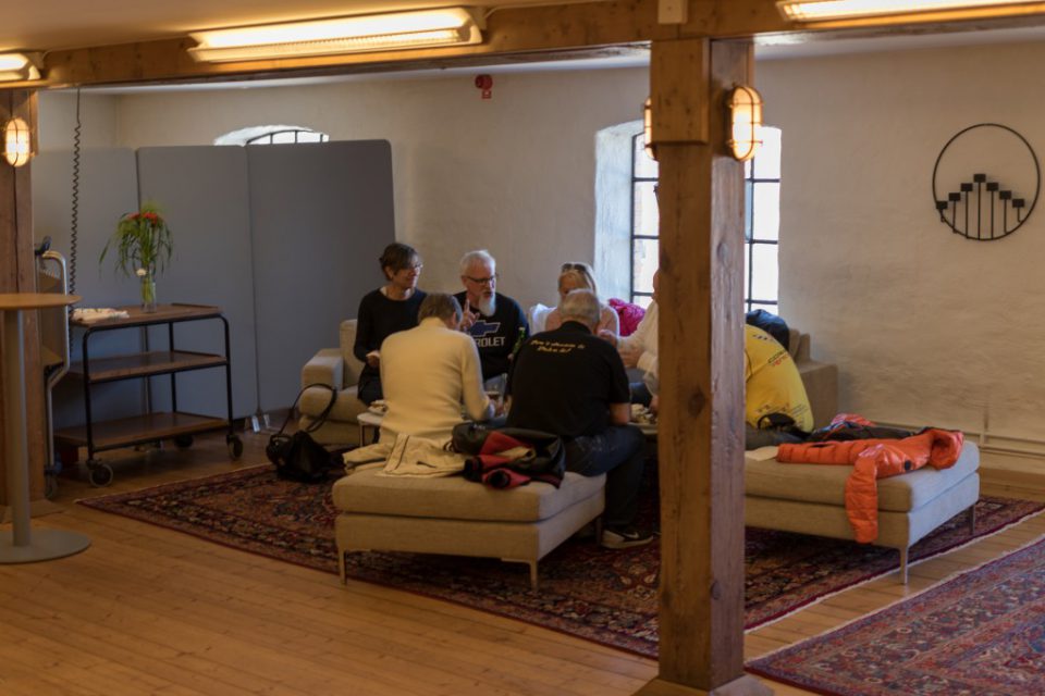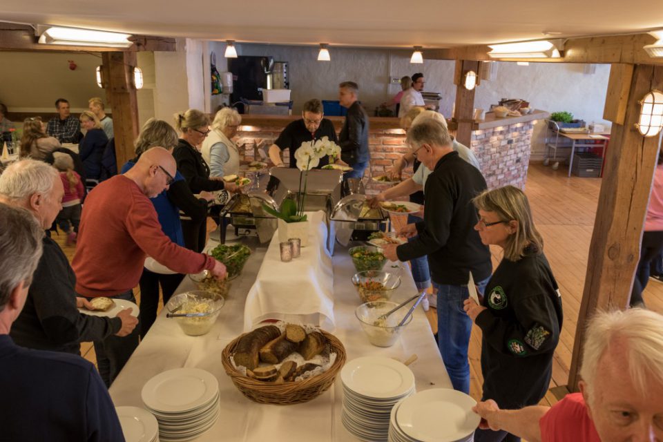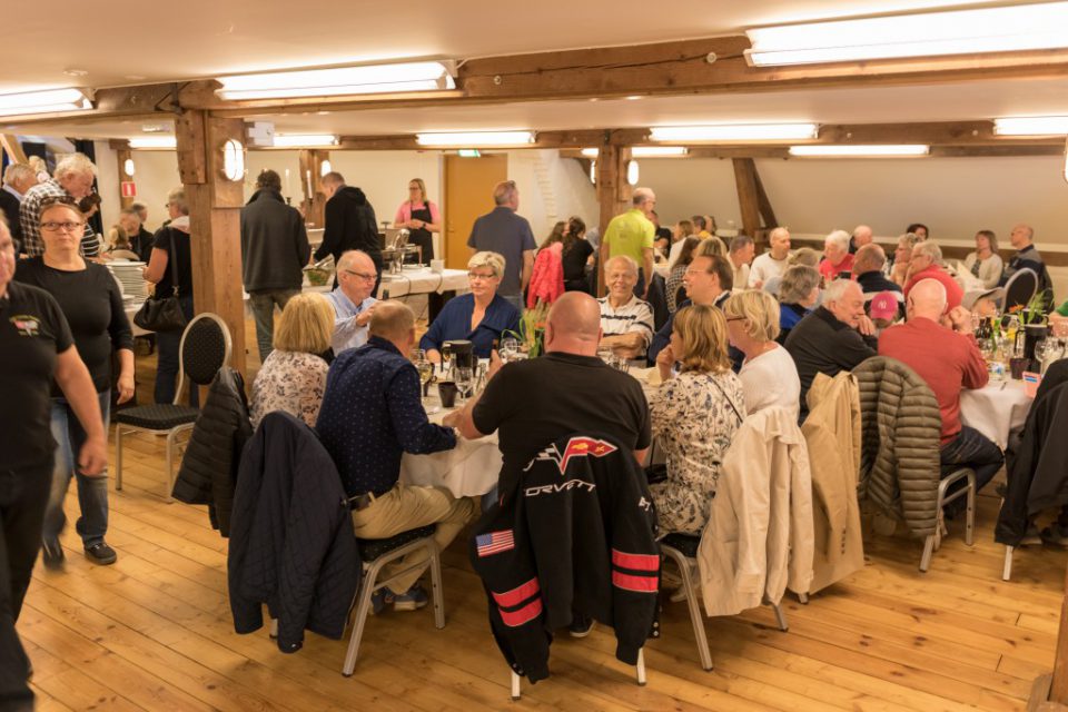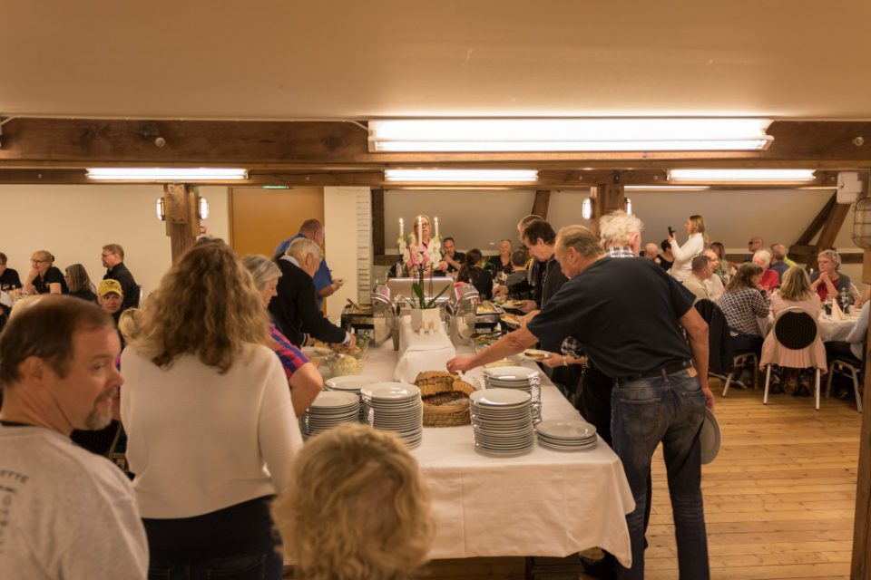 Det är alltid kul att träffa klubbkamraterna, några känner man väl andra har jag bara sett någon gång. Denna gång var det ungefär 170 bilar och uppåt 270 personer så det är en del att ta in. Framåt tolvtiden är det dags att äta lunch. Upp i ladan och där är det dukat. Buffé med pannbiff och potatisgratäng samt tillbehör. Som alltid, gott och vällagat. Dessutom kaffe med kakor efteråt. Den som inte blev mätt här får skylla sig själv. Okej då, är man vegan kanske det blev knapert.